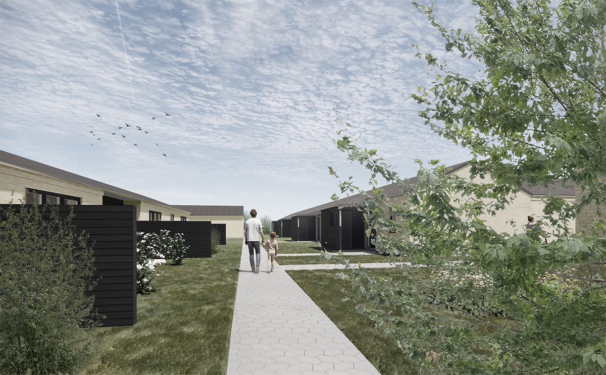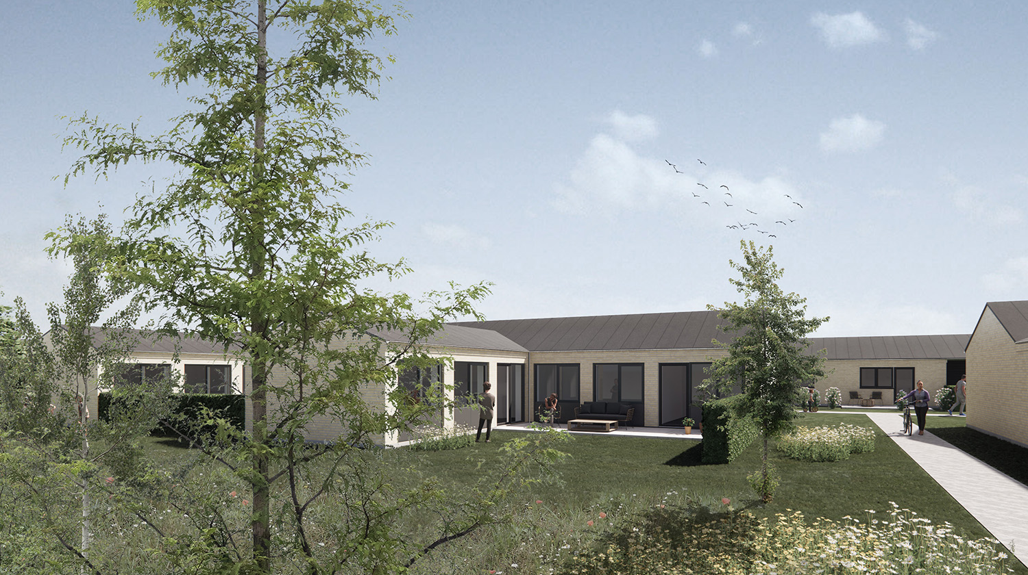 De 16 tilgængelighedsboliger får små skure og overdækkede indgange, mens de øvrige boliger deler moderne fælles pulterrum.