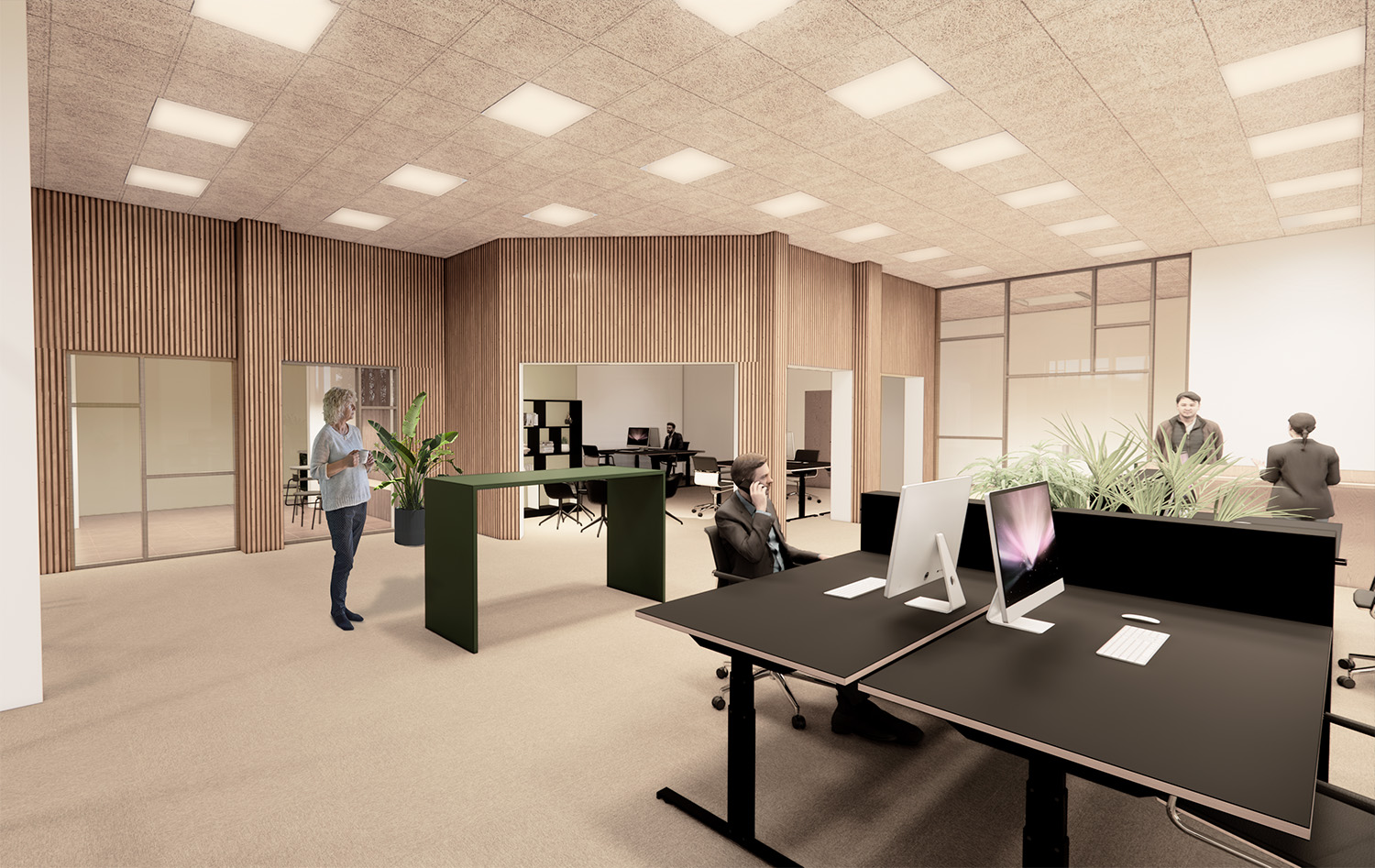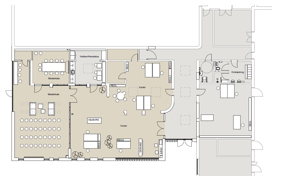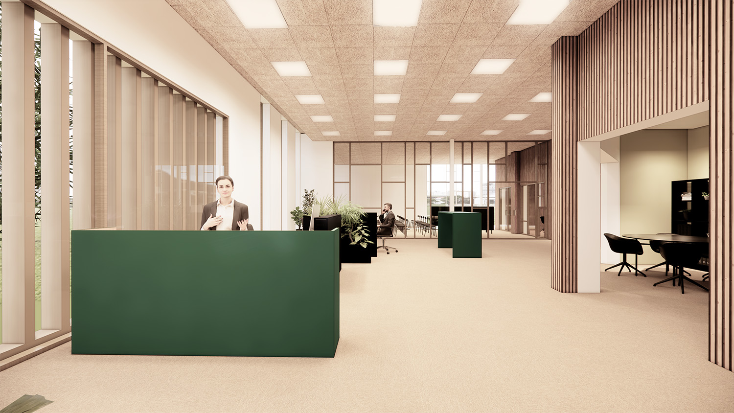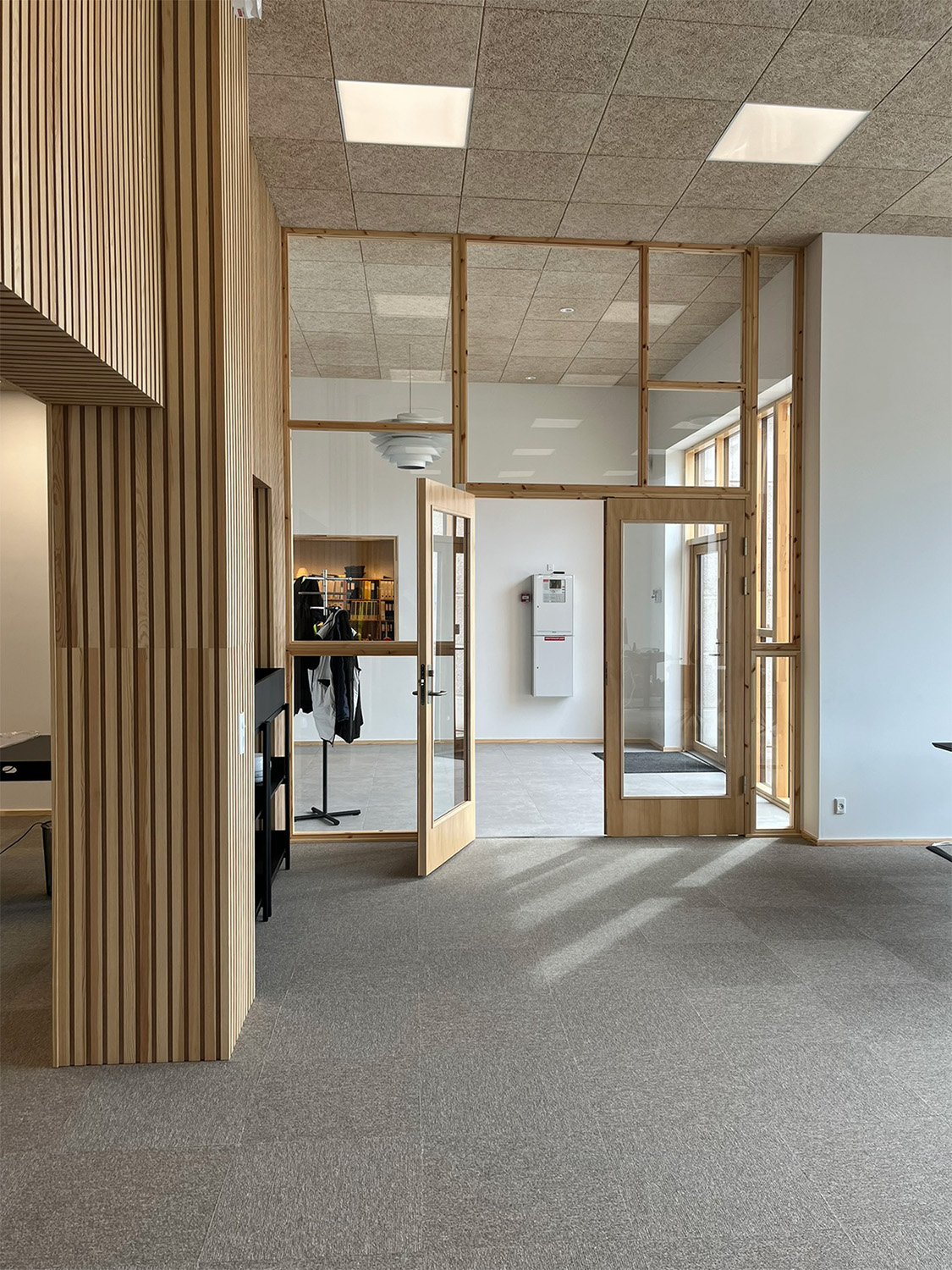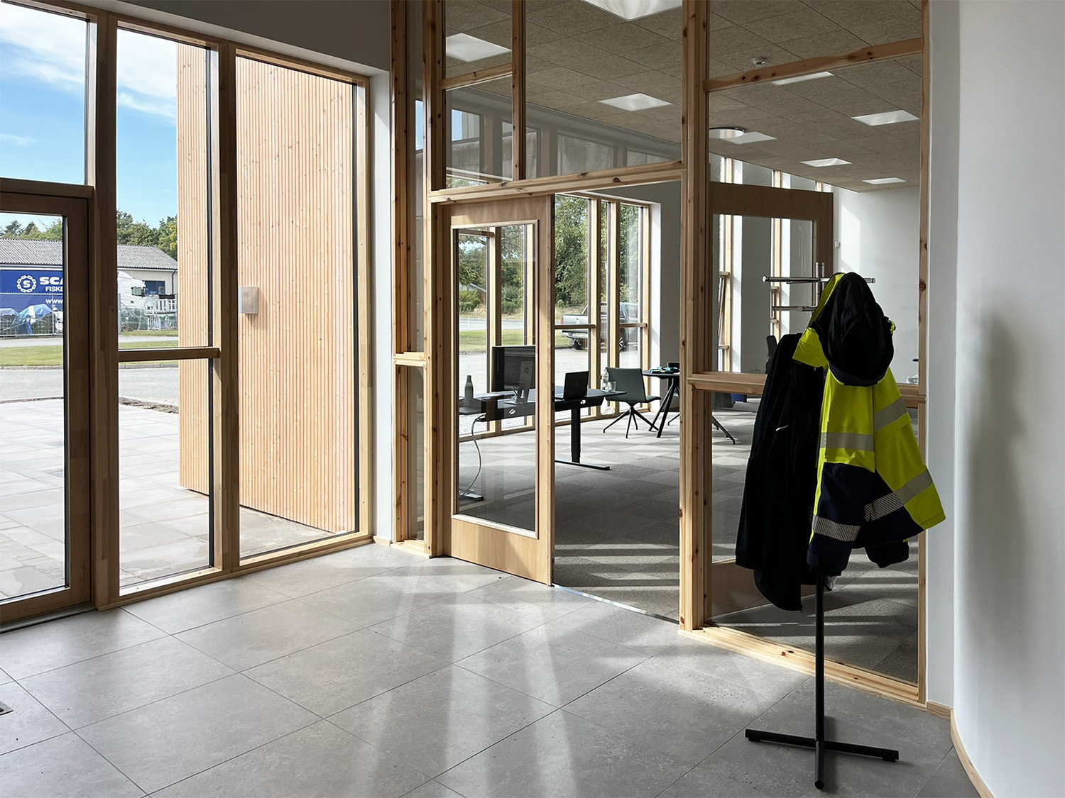 Indvendigt er der lagt stor vægt på at skabe gode arbejdsmiljøer med fokus på trivsel, dagslys og materialernes sanselige kvalitet. En varm og imødekommende farvesætning kombineres med træets naturlige varme i karme og overflader, mens lamelvægge bidrager med både akustiske kvaliteter og en blødere rumlig oplevelse. Interiøret understøtter en funktionel hverdag, hvor teknik og menneskelige behov mødes i en harmonisk balance.